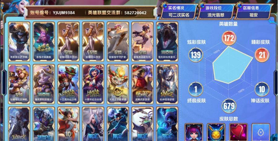172英雄 818皮肤总数(原皮+炫彩) 679皮肤 1终极 10神话...¥1888.00